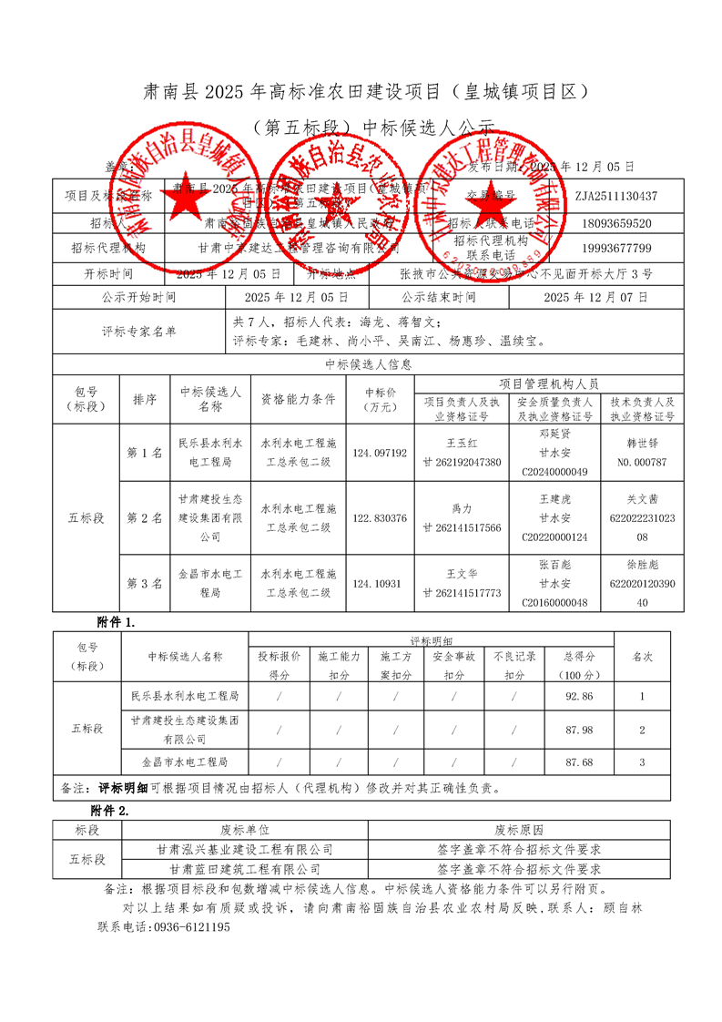 [市本级]肃南县2025年高标准农田建设项目(皇城镇项目区)第五标段中标候选人公示