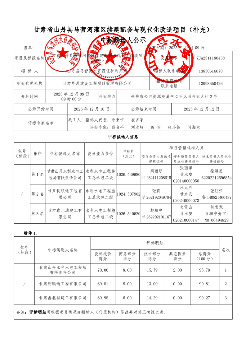 [市本级]甘肃省山丹县马营河灌区续建配套与现代化改造项目(补充)中标候选人公示